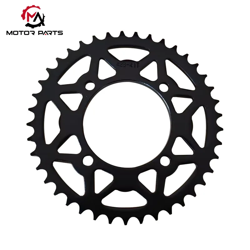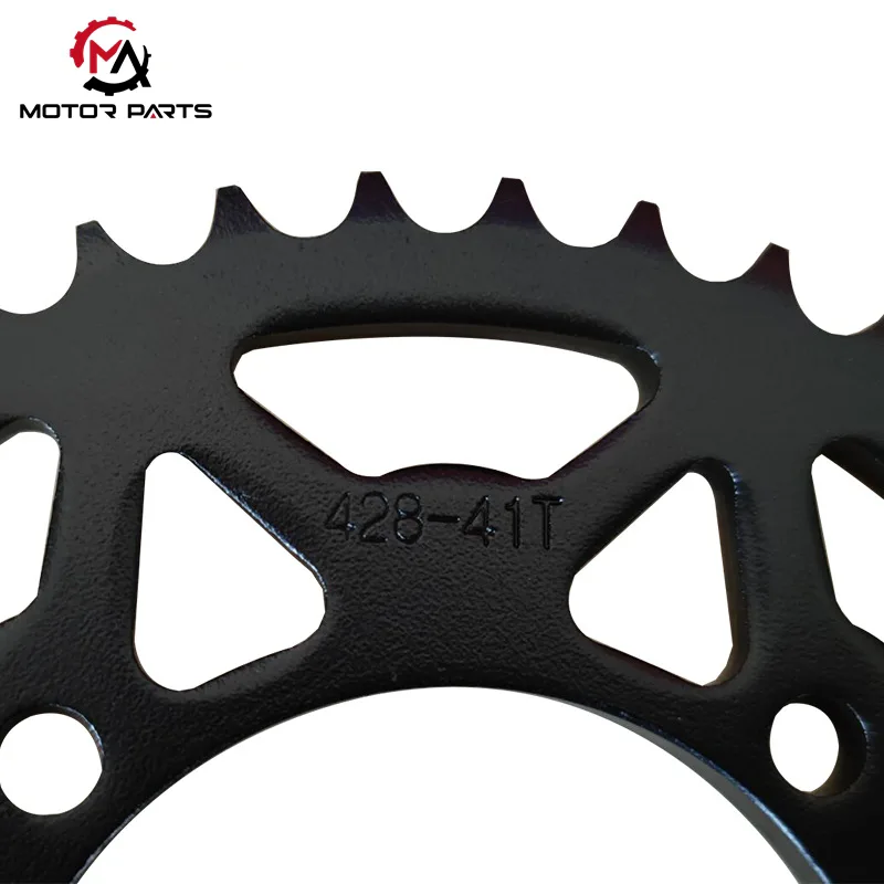 Kot profesionalna tovarna zobnikov za motorna kolesa uporabljamo legirano jeklo z visoko natezno trdnostjo in CNC natančno oblikovanje ter dvostopenjski postopek toplotne obdelave (kaljenje in popuščanje), da zagotovimo, da ima površina zob zadostno trdoto, medtem ko osnovne komponente zobnika za motorna kolesa 428-41T ohranjajo močno odpornost na udarce. Specifikacija z 41 zobmi je optimizirana za odziv pri pospeševanju in ekonomičnost porabe goriva.