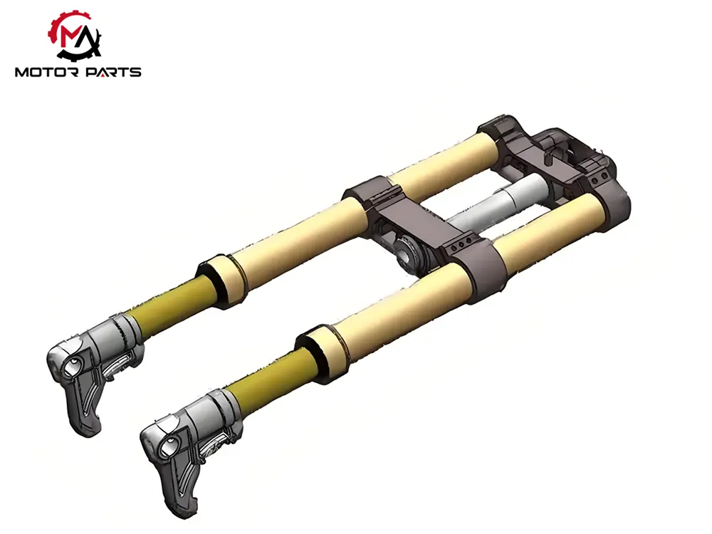 The front fork plays a dual role in steering guidance and shock absorption. It is composed of the front fork riser, left and right fork tubes, shock absorber springs, dampers, and front axle. The front fork riser is connected to the head pipe of the frame through a steering bearing and can freely rotate around the axis of the head pipe; The lower end of the left and right fork tubes is connected to the front axle through a lower connecting plate, while the upper end is fixed to the upper connecting plate; The shock-absorbing spring and damper are built inside the fork tube to absorb the impact caused by road bumps.
