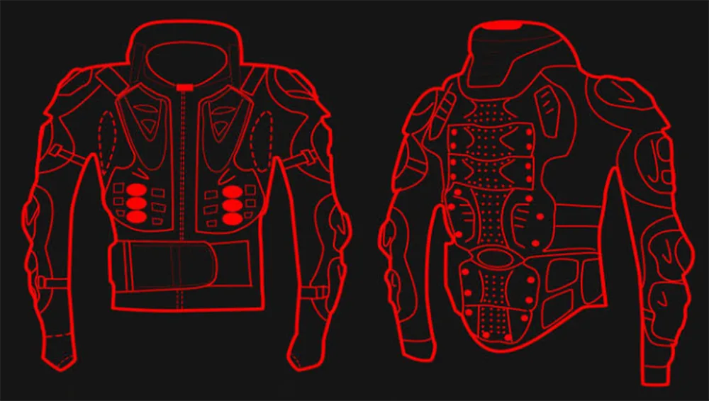 Visokotrdni kompoziti: oklep za zgornji del motornega kolesa, zasnovan tako, da prenese udarce pri visoki hitrosti. Absorpcija energije v obliki satovja: posebna notranja struktura, zasnovana za razpršitev kinetične energije po površini, kar zmanjšuje lokalizirane travme. Zaščita s popolnim pokrivanjem: strateška zaščita za ramena, komolce, prsni koš in hrbet.