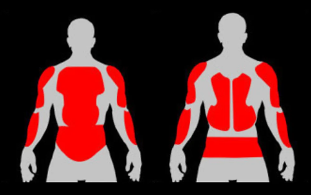 Motociklistični oklep za zgornji del telesa Opremljen z brezšivnimi vmesniki z zadrgo za neposredno povezavo s kolesarsko obleko za enoten zaščitni sistem. Sklepne plošče so anatomsko poravnane, da se ujemajo z zaščitnimi območji kolesarskih rokavic in hlač.